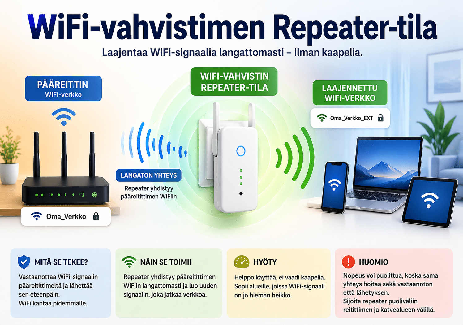 Repeater-tilassa laite ottaa olemassa olevan WiFi-verkon vastaan langattomasti ja lähettää sen uudelleen eteenpäin.