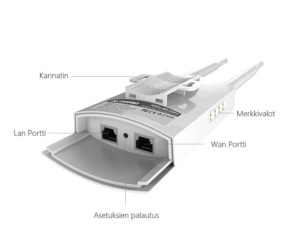 | Antennit | 2 x 5dBi ulkoista antennia |